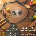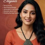 Elevate your ethnic wardrobe with this stunning, handcrafted terracotta jewellery set. Featuring a bold, geometric pendant and matching teardrop earrings, this set is intricately detailed with vibrant, hand-painted floral motifs on a sleek matte black base.