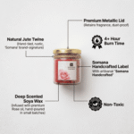 Elevate your space with the timeless elegance of the Somana Handcrafted Rose Scented Candle. Each jar is a labour of love, hand-poured in small batches to ensure a premium fragrance throw and a clean, consistent burn. Infused with the delicate essence of fresh blooming roses, this candle transforms any room into a sanctuary of “Aromatic Bliss.” The rustic charm of the hand-tied jute twine combined with a sophisticated gold lid makes it a perfect centrepiece for your home or a thoughtful gift for someone special.