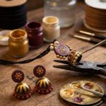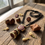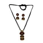 his exquisite jewelry set is meticulously handcrafted from natural baked clay (terracotta). It features a bold, circular pendant adorned with intricate hand-painted floral or tribal motifs, suspended from a durable, adjustable black thread. The set is completed with matching Jhumka-style earrings, blending rustic charm with vibrant artistic detailing. Its lightweight nature makes it an ideal choice for long-wear comfort during festivals or formal ethnic events.